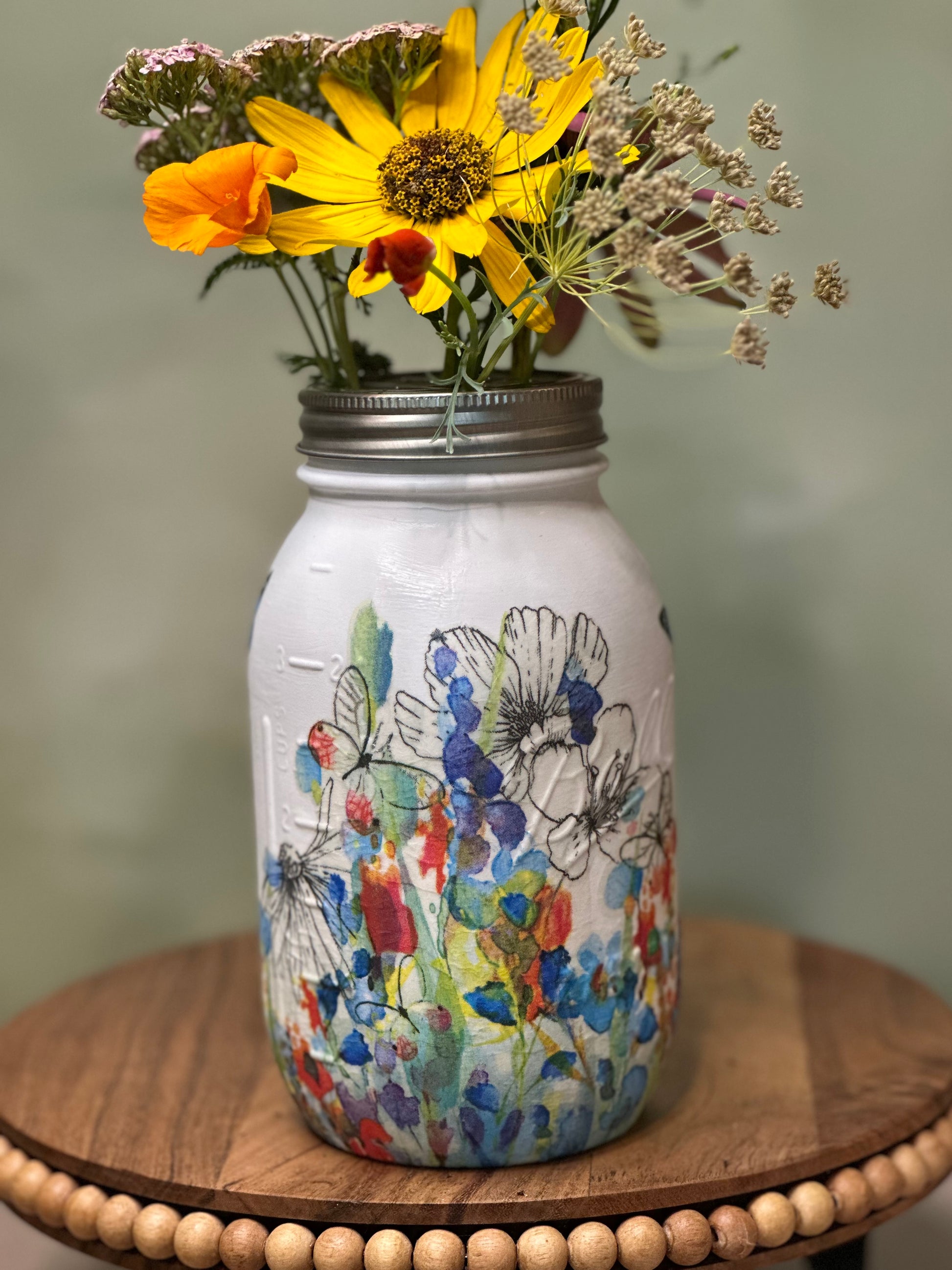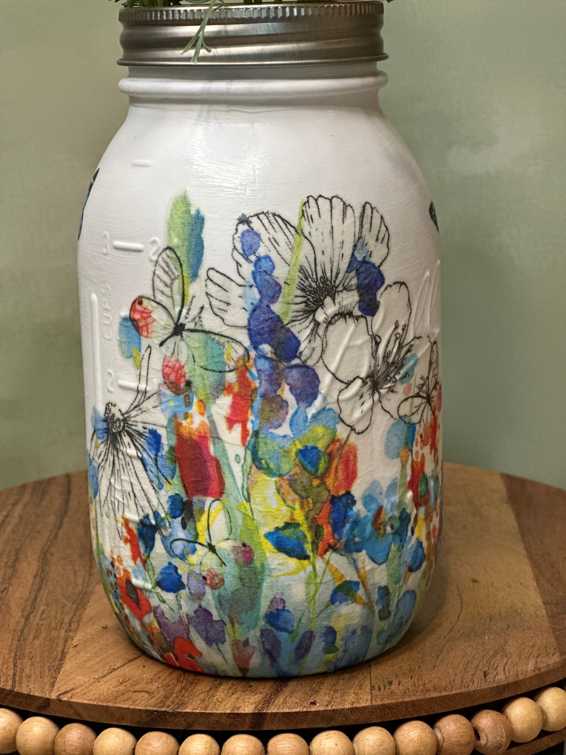 Each mason jar is created by first airbrushing outdoor enamel white paint then decoupaged with either a napkin or rice paper. It is layered with several layers of matte outdoor sealant, which can be wiped with a damp cloth if needed, but NOT submerged in water. Every jar is made to order, so each creation is uniquely yours! Each jar has the silver band holding a metal flower insert to help you create a beautiful bouquet with ease.